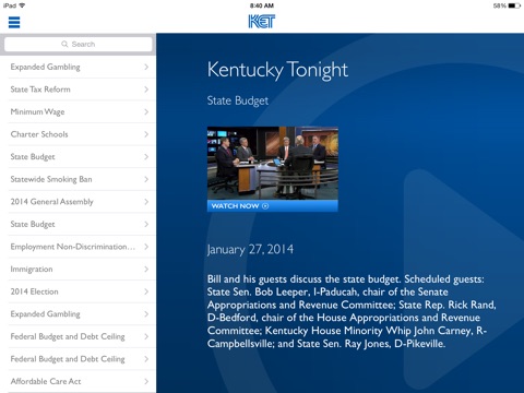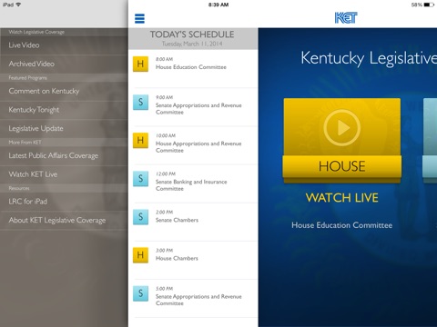 The KET Legislative Coverage app is your comprehensive app for staying informed about the Kentucky General Assembly. Access live and archived video coverage of committee meetings, chamber sessions, Kentucky Supreme Court hearings, and acclaimed KET public affairs programs like Kentucky Edition, Kentucky Tonight, and Comment on Kentucky. Stay up to date and share videos via email and social media. Download KET Legislative Coverage now and be an empowered participant in Kentuckys political landscape.