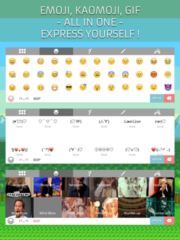 • Integrated Emoji Art Keyboard, one tap to input nicely crafted Emoji compositions.
