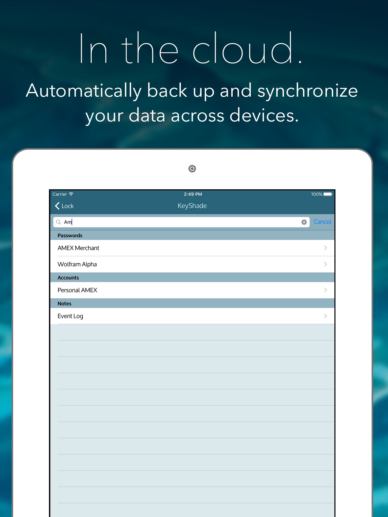 - Strong security credentials. AES encryption for data storage and transport, passwords hashed with >10,000 iterations of SHA-2. (Translation: nobody, including us, is able to read your KeyShade data without your master password.)