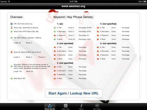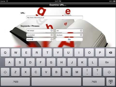 The app is simple to use. Simply enter your Website URL, up to 5 Key Phrases to look for, the tap Go.