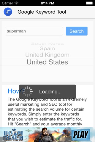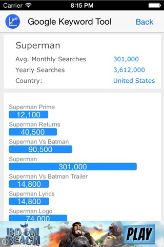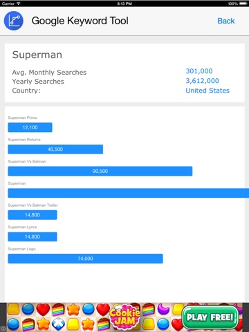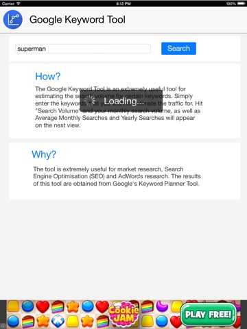 This Keyword Tool app is used to research keyword performance in Google Search. Simply search a keyword and its performance over the last 12 months will be revealed in the form of: