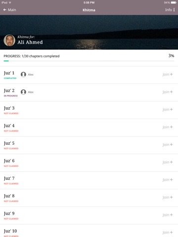 Khitma is an application designed to manage the collective grieving process of friends who cannot pay their respects in person. "Khitma" is the Arabic word for the complete recitation of the Quran. Start a Khitma for a recently deceased friend or join a Khitma in progress. Pledge to read one or more chapters to help carry out the customary Islamic ritual.