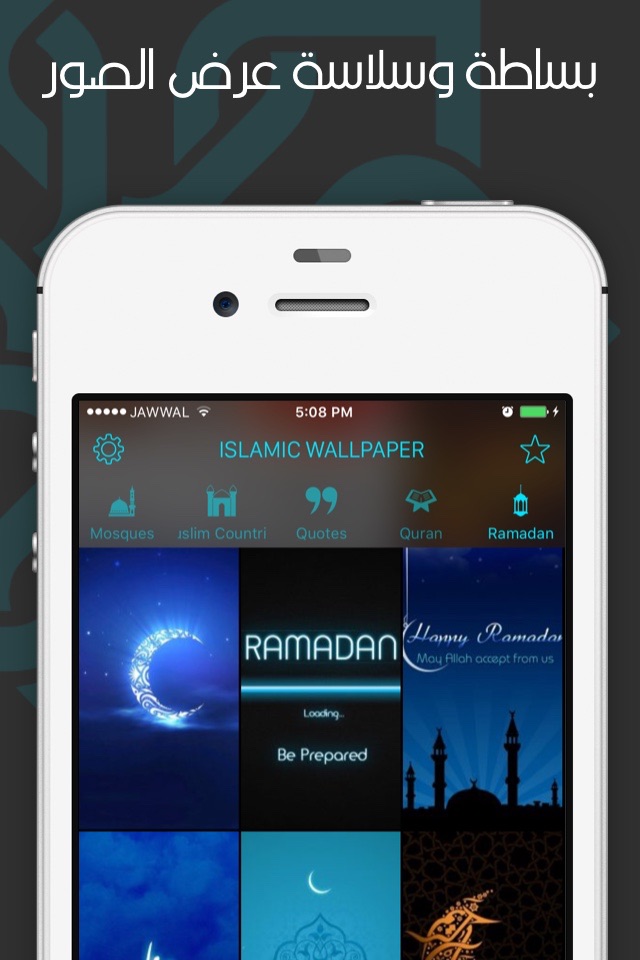 يحتوي التطبيق الفئات التالية من الخلفيات: مساجد و رمضان والكعبة وكلمات اسلامية ومدن اسلامية و القران