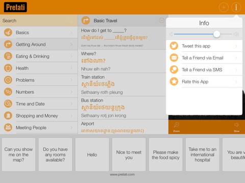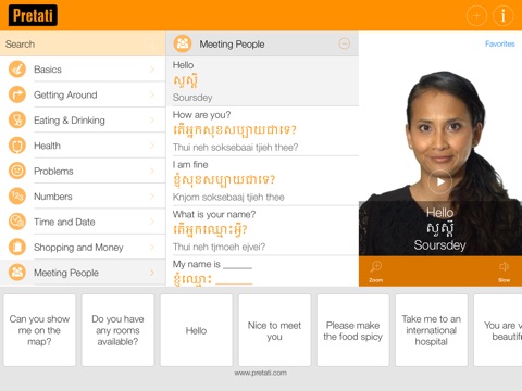 - A variety of CATEGORIES for every situation like Getting Around, Eating & Drinking, Health, Problems, Numbers, Time and Date, Meeting People, Shopping and Money – this is the perfect Khmer travel dictionary app around