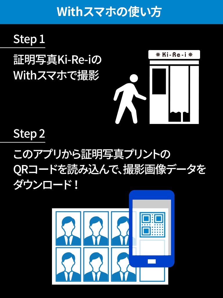 [Withスマホ]機能搭載の証明写真機Ki-Re-iで撮影した証明写真撮影データを再プリント(焼き増し)したり、iPhoneにJPEG画像として保存することができるサービスです。
