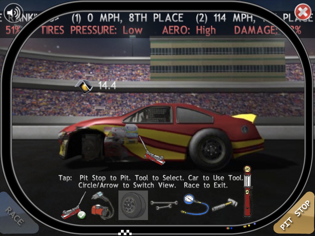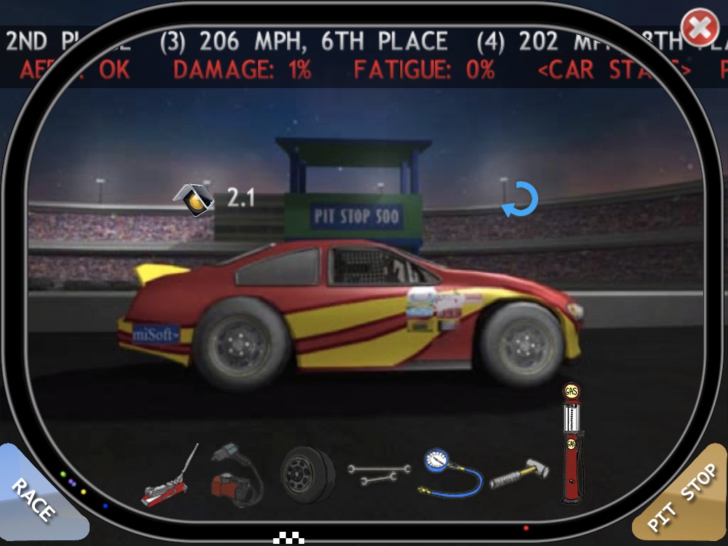 Tips: Tap Pit Stop to Pit before your Car passes Pit Lane. DO a few dry runs in the Pit Area to Practice before running a full Race. Tap Each Tool to Select and Tap Car to Effect. Tap Race to Exit the Pit Area. Each Tool adjustment effects the Cars Speed on the Track; take the time to adjust, the car runs faster, dont take the time, exit the Pit faster, you manage the strategy!