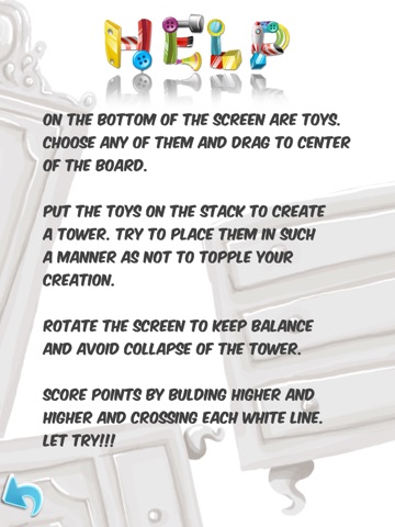 The game is dedicated to children. A main task for the young player is to build a tower of toys. User starts with level which is located in core of the Earth and finishes in the Universe. Efficiency and flair are needed, because application is sensitive to user moves.