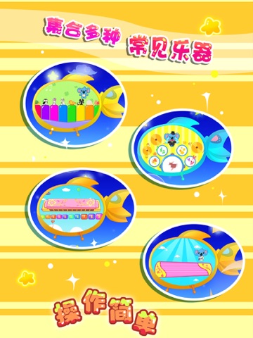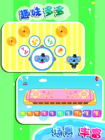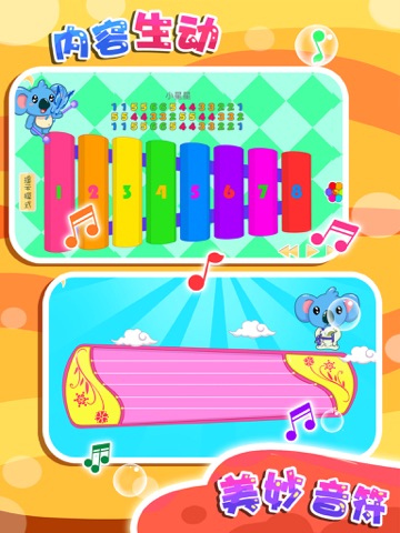 1、木琴:木琴声音清脆悦耳,发挥你的音乐才华来为我们演奏一曲动人歌曲吧。2、钢琴:8个音符的任意组合,创造出快乐美妙的篇章。3、架子鼓:由五个鼓,两面吊镲组成.点击不同的鼓和镲,会有意外的惊喜哦!4、古筝:通过简单的5跟弦的组合弹奏出宁静悠扬的韵律。