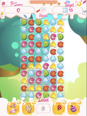 Candy animation and match same letters, destroy complete line with match, you can pay extra time, extra moves to get 3 stars.