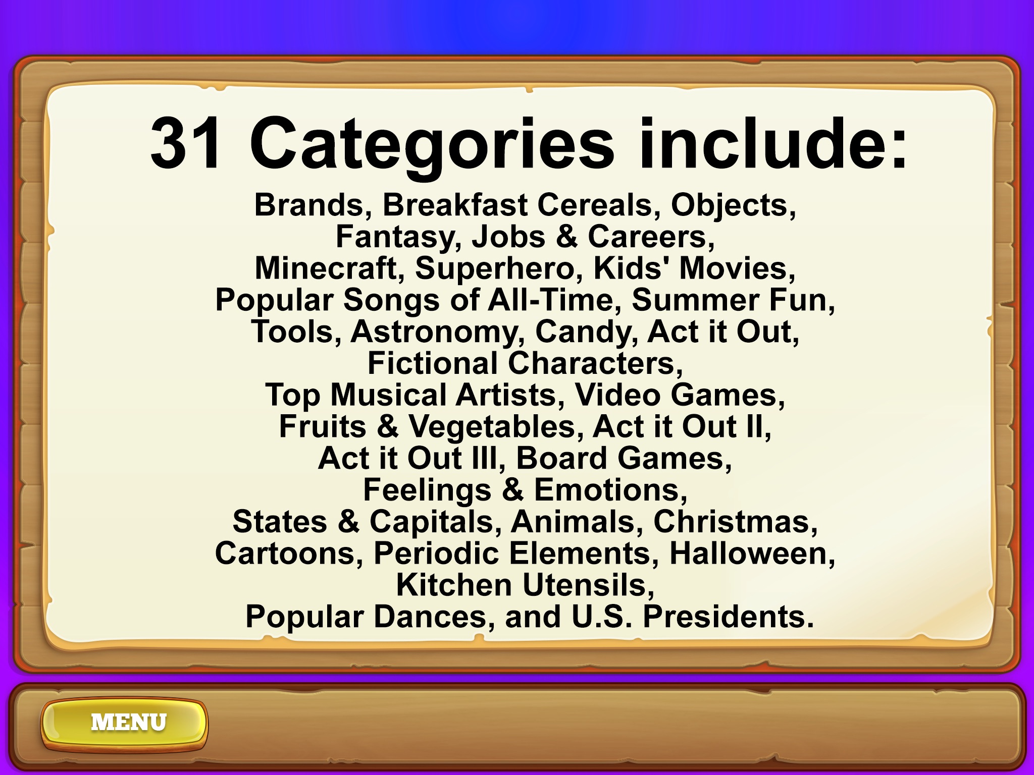 Brands, Breakfast Cereals, Objects, Fantasy, Jobs & Careers, Minecraft, Superhero, Kids Movies, Popular Songs of All-Time, Summer Fun, Tools, Astronomy, Candy, Act it Out, Fictional Characters, Top Musical Artists, Video Games, Fruits & Vegetables, Act it Out II, Act it Out III, Board Games, Feelings & Emotions, States & Capitals, Animals, Christmas, Cartoons, Periodic Elements, Halloween, Kitchen Utensils, Popular Dances, and U.S. Presidents.