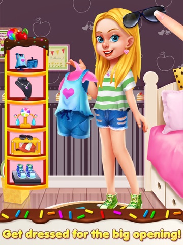 Start by taking her to the shop to find a beautiful outfit and pick a great look for her opening day. Choose from lots of different dresses, suits and t-shirts. Add accessories like shoes, jewelry and hats. Don’t forget the adorable apron for the best baker on the block!
