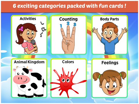 - 6 categories: activities, body parts, feelings, colors, counting, animals