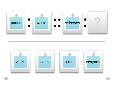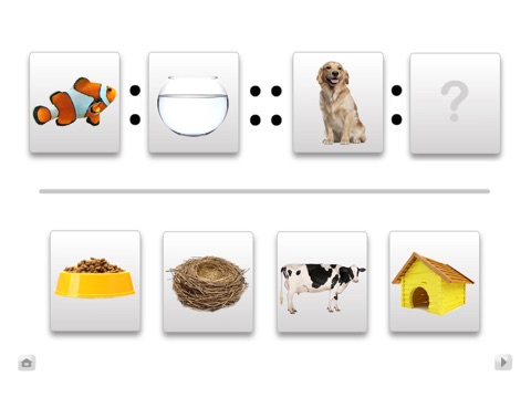 Most standardized tests still use analogy questions, which are presented in a format of A : B :: C : ___, and can be understood as “A is to B as C is to what?” This app is set up with a similar design, to get kids used to this style of comparison. Also, you will find that children are challenged with a variety of visual pictures and verbal concepts in order to hone their skills. This unique combination of images and words provides kids a fun and creative way to build their vocabulary, develop analytical skills and visual awareness. There are 4 sets of 16 analogies presented 12 at each time, with a total of 64 analogy questions. The placement of questions and answers is varied with the start of each new game. This allows the user to have an entertaining and unique experience every time they play!
