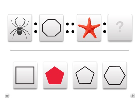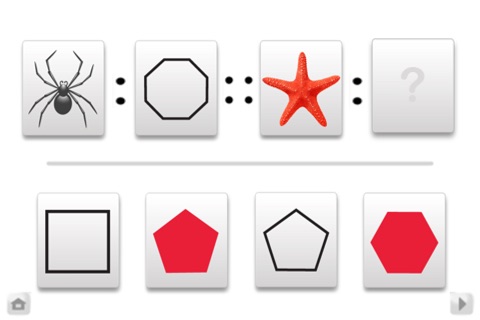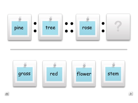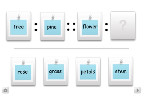 Most standardized tests still use analogy questions, which are presented in a format of A : B :: C : ___, and can be understood as “A is to B as C is to what?” This app is set up with a similar design, to get kids used to this style of comparison. Also, you will find that children are challenged with a variety of visual pictures and verbal concepts in order to hone their skills. This unique combination of images and words provides kids a fun and creative way to build their vocabulary, develop analytical skills and visual awareness. There are 4 sets of 16 analogies presented 12 at each time, with a total of 64 analogy questions. The placement of questions and answers is varied with the start of each new game. This allows the user to have an entertaining and unique experience every time they play!