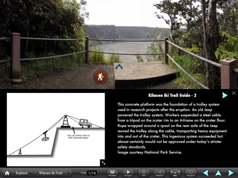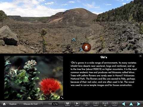 Hike the Kīlauea Iki Trail in Hawai‘i Volcanoes National Park. 360 degree panoramas; videos and photographs of spectacular lava flows and eruptions lets you experience the splendor of Kīlauea Volcano. Use it on location as an immersive tour guide as you walk through lush Hawaiian rain forest down to a once-molten lake of lava on the crater floor. Identify unique plants and geological features. Hi-resolution panoramas and detailed trail guides bring to life the dramatic eruption of Kīlauea Iki in 1959.