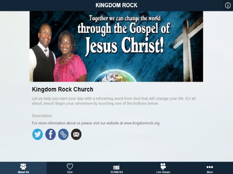 Join Pastors Mark and Sumiko Stroud as they teach the Bible in an easy to understand format that at times is quite humorous but always educational. This app is also apart of the Kingdom Rock Network, so from time to time youll hear a powerful word of inspiration from a guest speaker too. Dont forget to checkout our YouTube videos and connect with us on Facebook. By clicking the Prayer tab youll have direct access to our 24/7 prayer staff. We are always glad to take your request before the Lord. Keep in mind that new inspiring messages are added weekly and are sure to bless your soul. Your life will be forever changed by the "Good News" of Jesus Christ!
