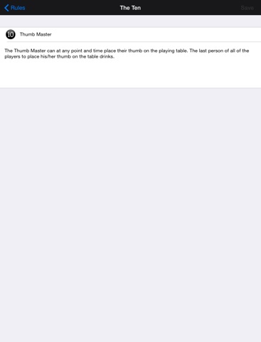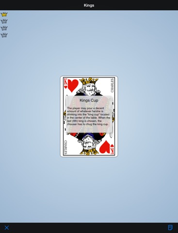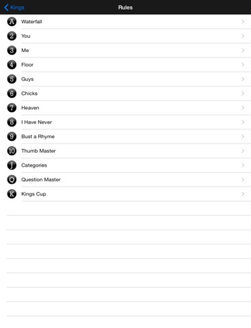 There are no fancy gimmicks with the program... it is really simple, as it should be. The rules are all the ones I used, but you can edit any card to get it to fit w/ your college memories. Once you start the game, you just tap through the cards, which come up at random. Great to use in a beer garden or camping or somewhere when you dont have a deck of cards. Its easier to use than a deck of cards... but, to be honest, it felt wierd the first time playing kings w/out a deck of cards. 5 stars because it does what it is supposed to do.