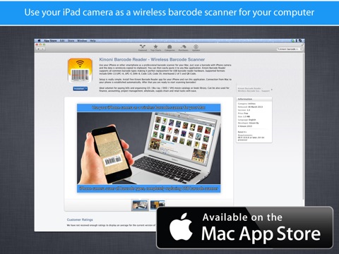 • Send barcodes directly to application or clipboard (Kinoni Barcode Reader Pro installed to Mac from http://www.kinoni.com required)