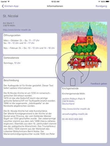 Einzelne Kirchen sind dabei durch einen Grundriss und durch eine Audioführung erschlossen: Sie können so die Kirche selber erkunden und entdecken. Sie können Stationen im Grundriss anklicken und zu der Station einen Text anhören oder durchlesen, während Sie durch die Kirche gehen. Ergänzend stehen auch Videos zu einzelnen Gemeinden und Kirchen zur Verfügung.