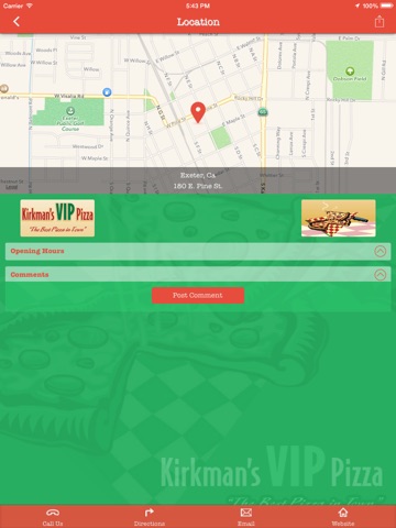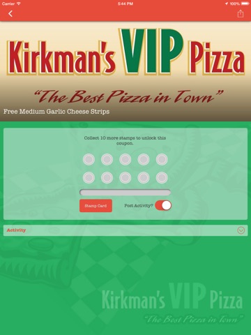 Kirkmans VIP Pizza is located in Exeter, California and is known for their delicious pizza and great customer service. Whether youre going to watch the game, enjoy dinner specials, or to bring the family over for some mouth watering pizza, Kirkmans has it all! Be sure to download the new mobile app to unlock coupon rewards for frequent visits and to receive exclusive mobile coupons.