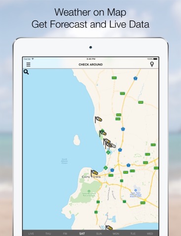 Scroll around on the map and get spots with perfect conditions at a glance. You select the day, then as you scroll on the map, spots with good weather condition are coloured.