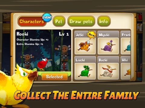 • Collect all 6 members of the Kiwi family! Rooki, Pinki, Wiki, Franki, Miyuki, and Bucki!