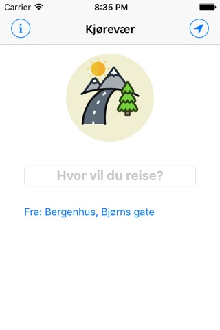 Legg inn hvor du har tenkt deg, og Kjørevær viser ruten(e). Trykk på en rute og få opp værinformasjon for 6 forskjellige steder langs ruten. Stedene finner appen basert på strekningen du har valgt. Den deler strekningen opp i 6 like lange deler og viser hvordan været er på disse stedene.