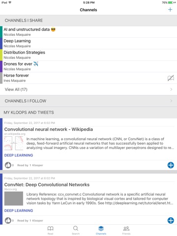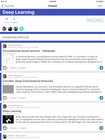 Channels are awesome for keeping articles handy but also to curate articles with friends on your favorite topics or projects. Kloops AI helps you stay informed and sends you suggested articles.
