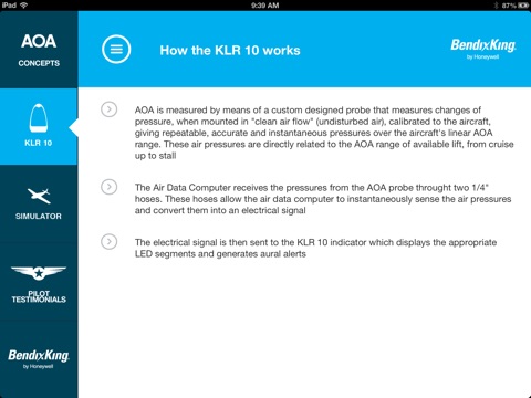 The BendixKing KLR 10 Lift Reserve Indicator app provides a free virtual tour of this innovative, low-cost product designed for experimental GA aircraft. The app includes a tutorial on the benefits of AOA for general aviation, an overview of how the KLR 10 works, plus a guided simulation which demonstrates the capabilities of this safety-enhancing product. Download it now for free and learn how AOA awareness with the KLR 10 can enhance your flying!