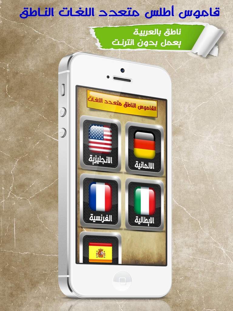 قاموس اطلس متعدد اللغات الناطق بالعربية بدون انترنت يترجم من والى العربية لخمس لغات مختلفة ( الإنجليزية – الألمانية – الفرنسية – الإيطالية – الأسبانية)