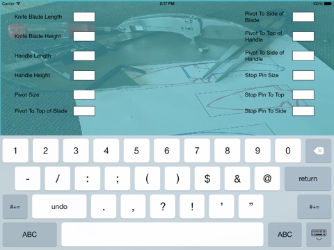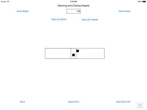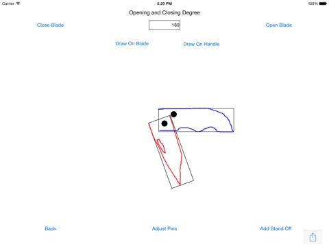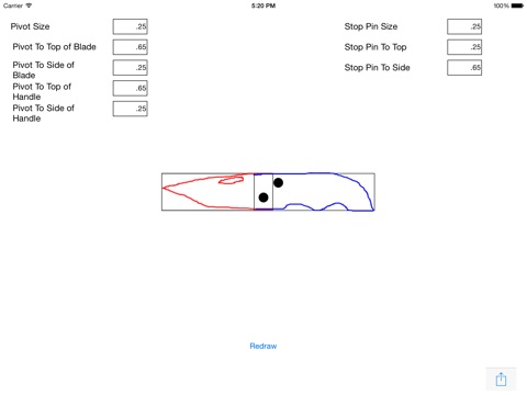 Knife Cad is an app for designing and viewing the mechanics of folding knifes. You set the size of your blade, handle, pivot pin and stop pin in inches. The app will draw these rectangles and circles in proportion to the sizes you entered, then allow you to draw your own blade and handle design. You can watch the blade open and close to make sure that your design works the way you want it to. You can adjust the size and position of the pivot and stop pins, then re-test your design. You can add up to two stand off pins of the size and location of your choice. When you are through designing your knife you can print your design for using as a template to make your knife. If you don’t have Air-Print or want to save the design for later use you can attach the PDF file to an email or message then save the attachment.