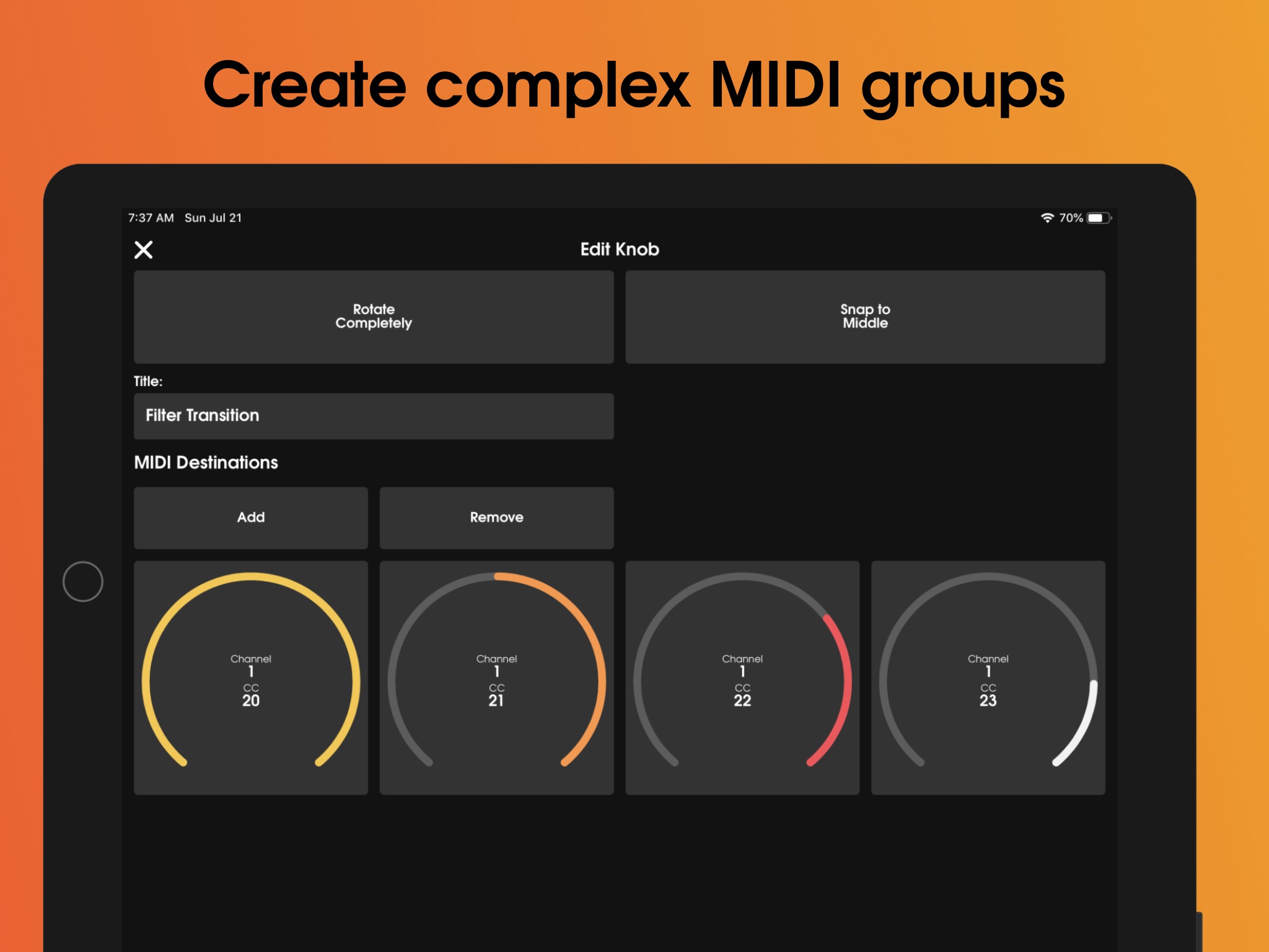 Knob Lab can control devices over USB, WiFi, Bluetooth, Virtual MIDI (inter app communication), Audiobus or with a cable.
