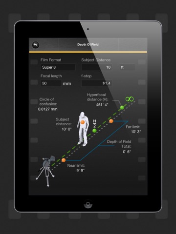 The KODAK Depth of Field Calculator app is designed to be used with any film format, including Super 8, 16, 35 and 65 mm. F-stops range from F1.4 – F22, with 1/3 stops included.
