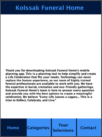 A funeral planning application that allows users to select caskets, urns, and various other products from our showroom from the comfort of their own home.
