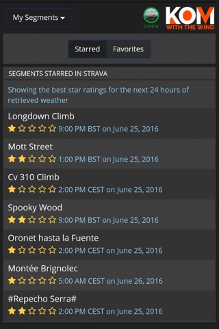 KOM With The Wind enables Strava users to assess segments based on the current wind conditions by calculating an hourly star rating for any given segment, for the next 24 hours.