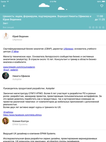 • содержит самое актуальное расписание докладов, при изменениях в программе уведомит вас о них;