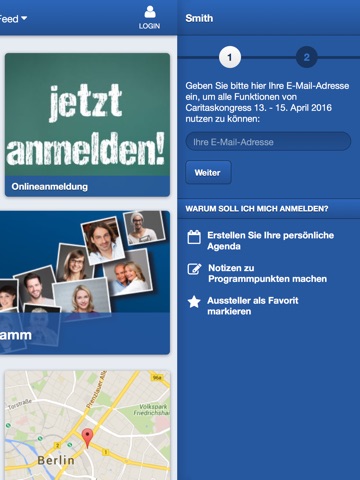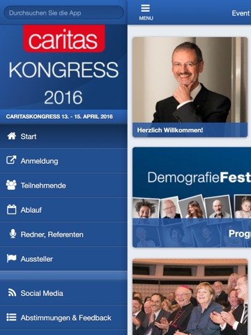 The official app of the German Caritas Association provides you with all necessary information about the Caritas Congress 2016 the mobile way. The app enables you to create your own daily schedule or to find background information about the speakers and the program contents. Moreover, you may participate in polls and votes and link with other participants. Besides you will get the latest news on program changes, can display the speeches and exhibitors locations and contact other participants (and exhibitors) before and during the congress.