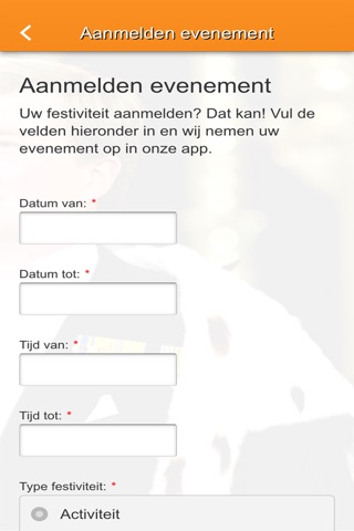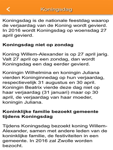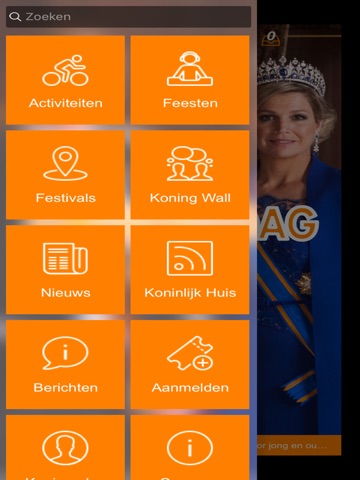 Met deze app blijf je op de hoogte van activiteiten, feesten en festivals in heel Nederland, kom je met andere evenement bezoekers in contact en volg je het laatste nieuws omtrent Koningsdag. Mis je een evenement of organiseer je er zelf één, meld deze dan eenvoudig aan via het formulier in de app.