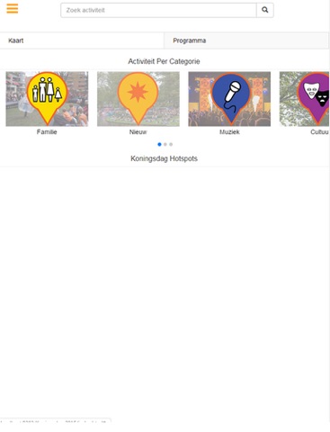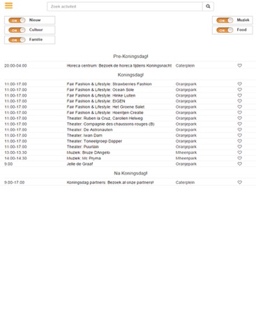 Alle activiteiten rondom Koningsdag zichtbaar op kaart en te filteren op categorie; Familie, Muziek, Food, Cultuur en Nieuw.