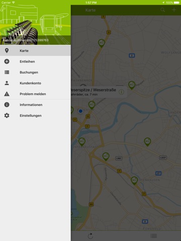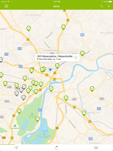 Die Karte zeigt die Konrad-Stationen. Auf der Liste der Konrad-Stationen ist die Entfernung zu Ihrem aktuellen Standort angegeben. Durch Tippen auf ein Fahrrad-Icon können Sie Konrad direkt mieten. Nach Ende Ihrer Konrad-Tour geben Sie Konrad an jeder Konrad-Station in Kassel zurück (außerhalb von Stationen ist KEINE RÜCKGABE möglich)