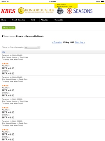 Konsortium Group Bus Ticket app is an easy-to-use app to book your express Bus tickets to the most sought after destinations in Malaysia, Singapore and Thailand. In a few simple steps you can book a comfortable, relaxing bus trip to Cameron Highlands, Genting Highlands, Johor, Kedah, Kelantan, Kuala Lumpur, Malacca, Pahang, Penang, Perak, Singapore and Terengganu.
