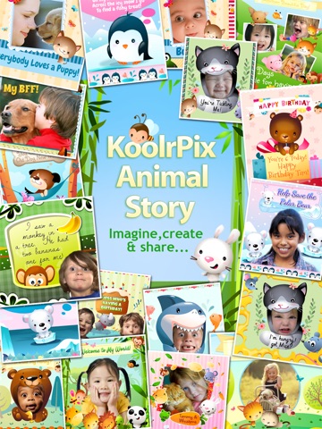 KoolrPix Animal Story celebrates the joy that animals bring to any childs life with a fun-filled way to add text, as well as overlay animal stamps and frames to all your treasured family photos. Let your imagination take you to an enchanted world filled with the cutest collection of animal characters and ready-to-go templates that are guaranteed to put a smile on any kids face! Just load your own photo or select a story template and start having fun! A virtual story telling adventure awaits you and your family with KoolrPix Animal Story!