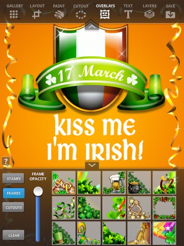Take a picture, load an archived photo or select a customizable template from the KoolrPix St. Pattys Day Gallery. Then get creative by adding text, romantic stamps and decorative frames that show your Irish. Even create your own unique cutout stamps from any source image and save them in your personal stamps gallery. Finger paint on any design with variable brushstroke feathering and transparency. KoolrPix St. Patricks Day will shower you in rainbows!