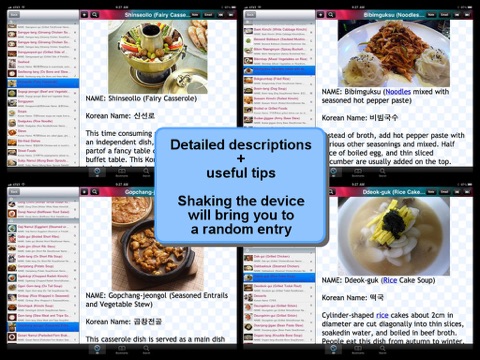 Korean Food Bible is an application containing information of over 120 different kinds of korean food. For every type of food included, the following information is available for reference: