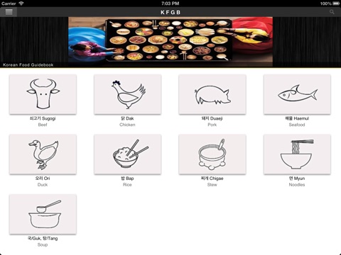 KFGB is an intuitive reference and on the go guide with highly detailed images and descriptions for beginners and those wishing to explore Korea and its many cuisines 한국 음식 안내.