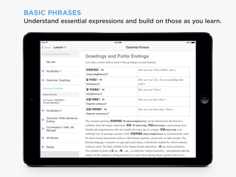Start learning Korean right away with FREE lessons. The experts at Living Language take you beyond the basic phrasebook. We offer a complete course that will teach you how to speak Korean right from the start using essential words and phrases. Weve taught millions how to speak new languages over the past 65 years, and now weve made our proven method available in an app thats fun, engaging, and easy to use.