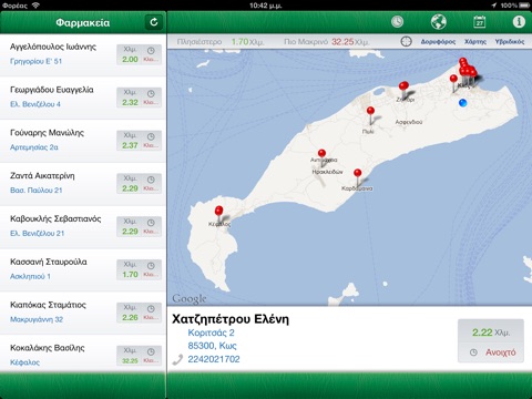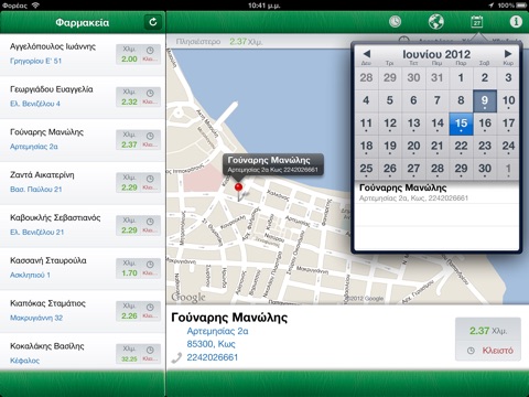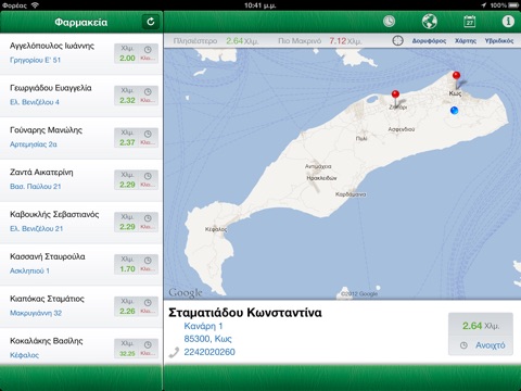 Data for this call is forwarded by the Pharmaceutical Association of Dodecanese - Annex Kos. The application needs an Internet connection via WiFi or 3G.