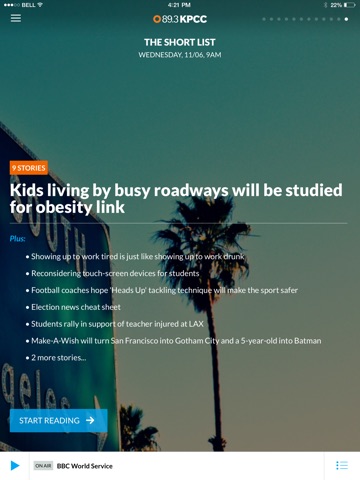 Every time you launch the app, KPCCs live broadcast is always a tap away.