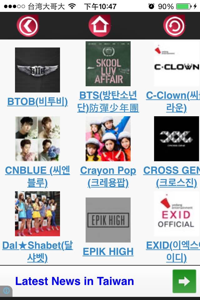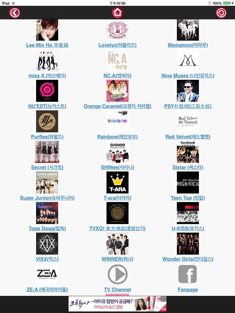1.當下最流行的kpop 的MV,也歸納出韓國歌手、偶像團體加以分類;很輕易地引導至每個歌手的Facebook和MV的畫面