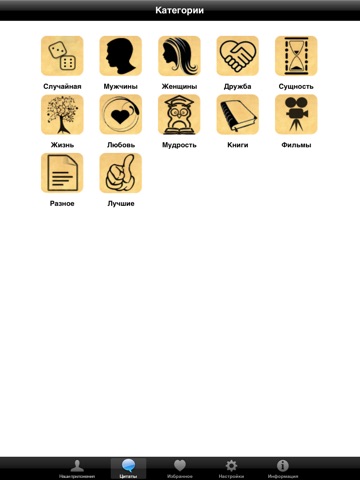 Данная программа вобрала в себя множество цитат великих людей, замечательных фильмов и книг, разбитых для удобства на категории. Делитесь понравившимися высказываниями с друзьями на Facebook или Vkontakte.